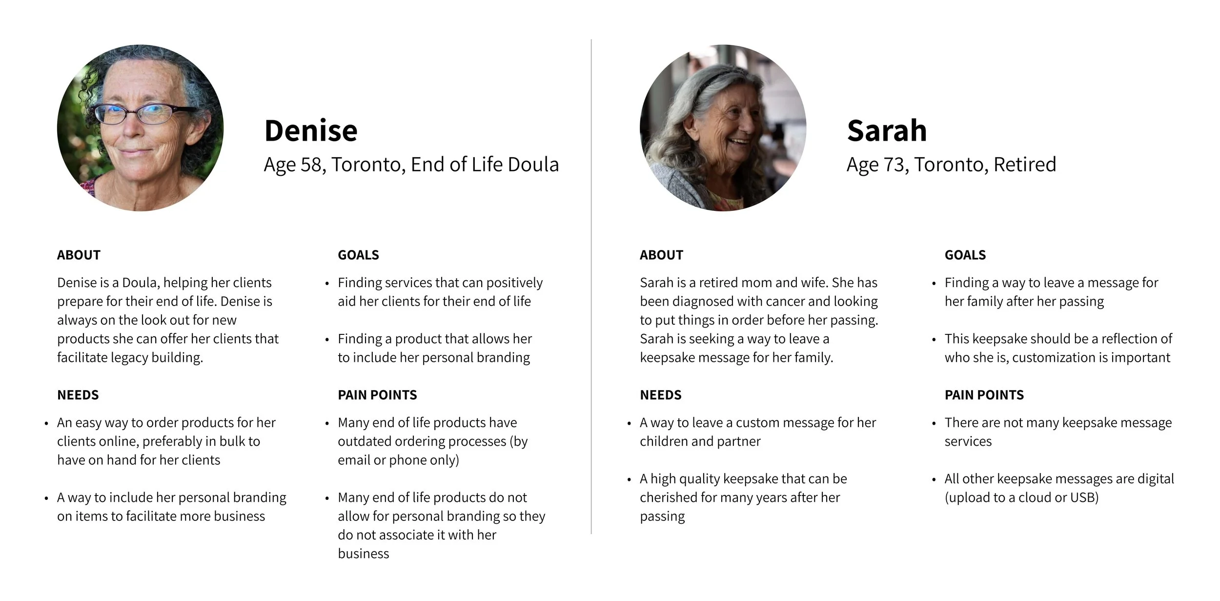 Having spoken to individuals in the end of life industries, and individuals who were in pre-planning stages of their life, I now had a better sense of who our users were and who we were designing for. I created two personas– meet Denise and Sarah!