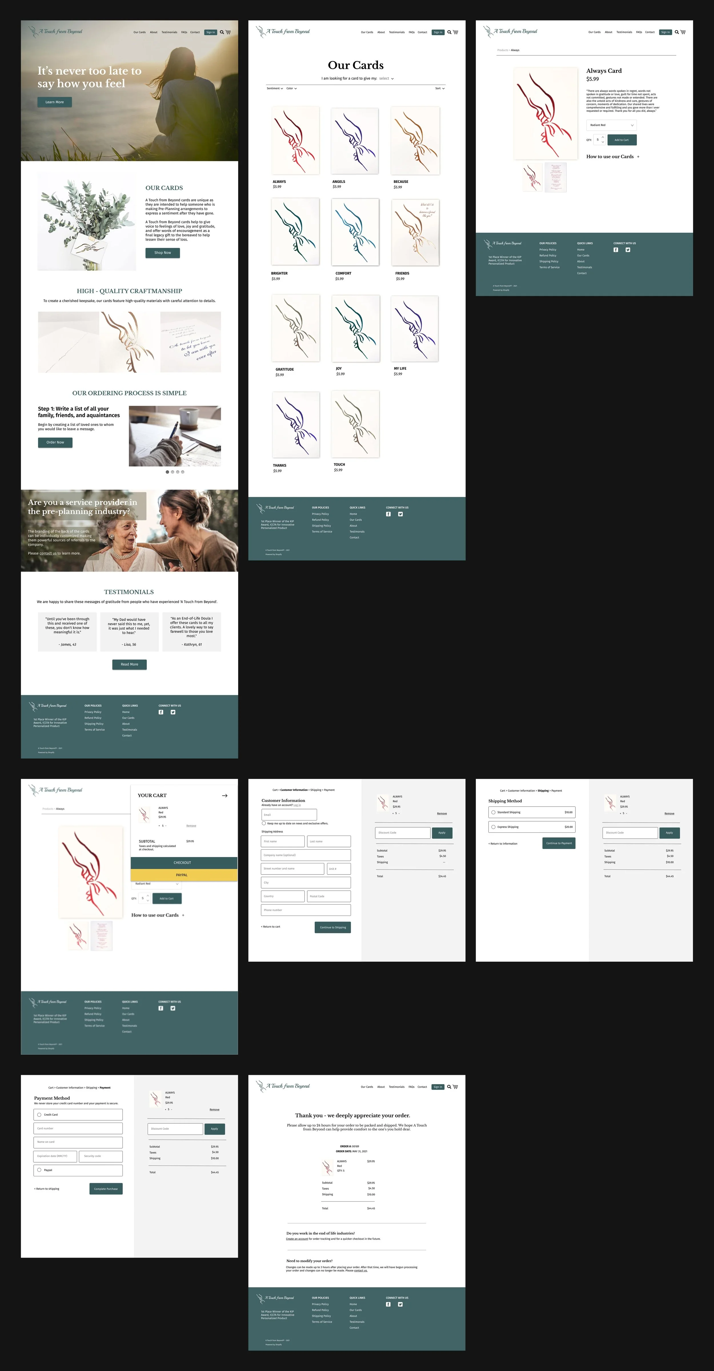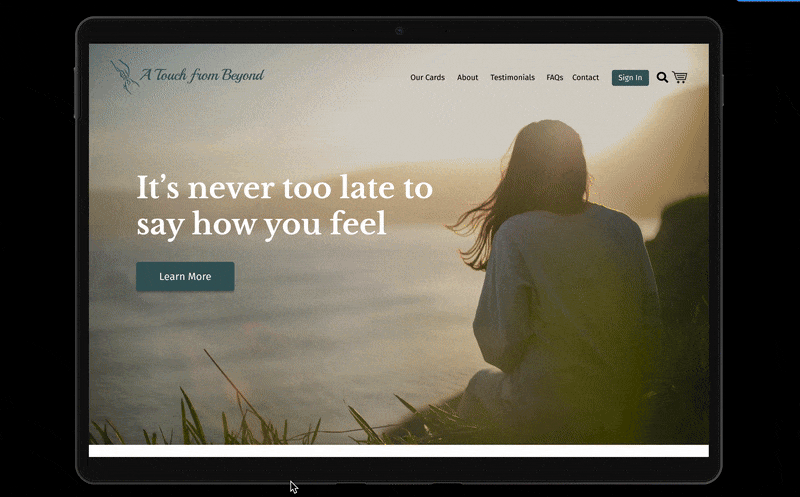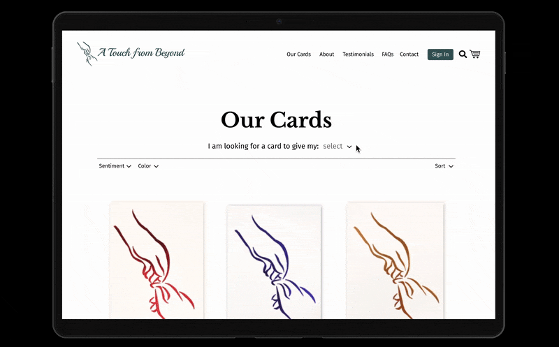 A Touch from Beyond provides cards for one nearing the end of their life– they can write messages and sign the cards for their loved ones. The cards are then given to the bereaved after their passing. My client had to step away from their business for several years to deal with their own personal loss, leaving the website outdated. The end outcome was to update the website and add e-commerce capability.
