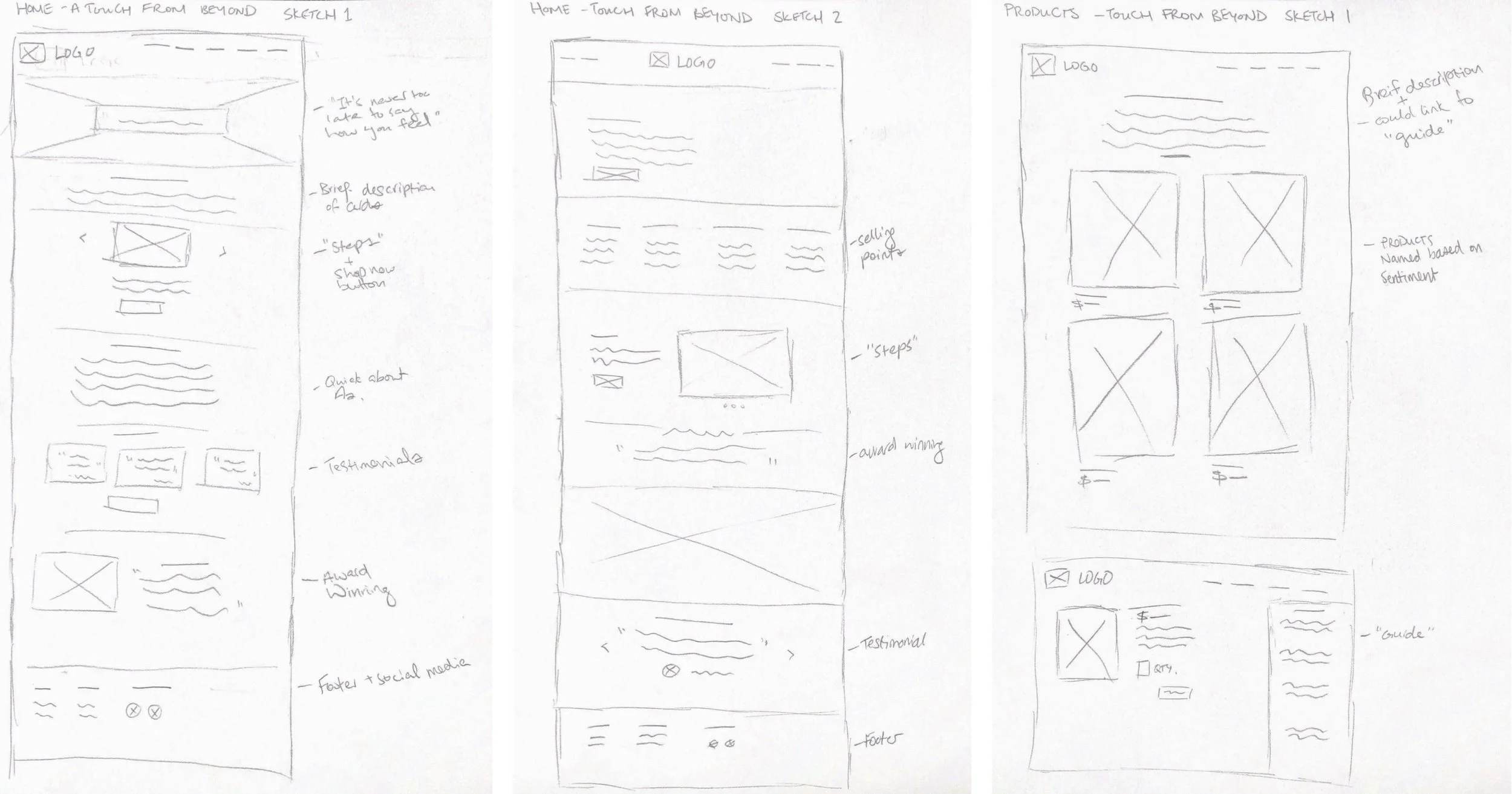 I was excited to begin this step of visualizing the site on paper. I mocked up some low fidelity sketches as a quick way to figure out how components of our site would fit together. I kept in mind the user’s interaction with the site, our team and client’s goals, and the information architecture during this step.