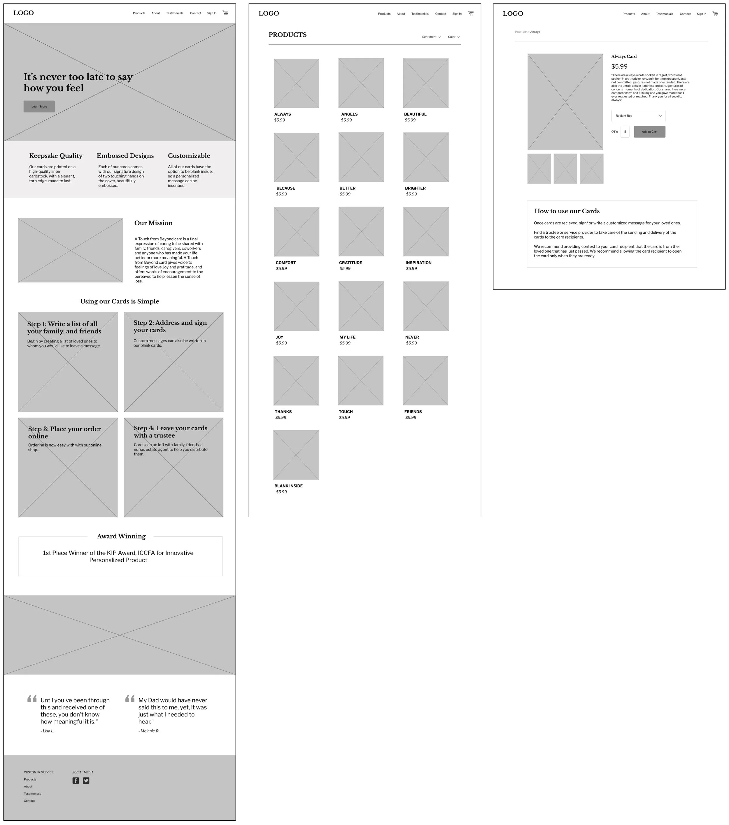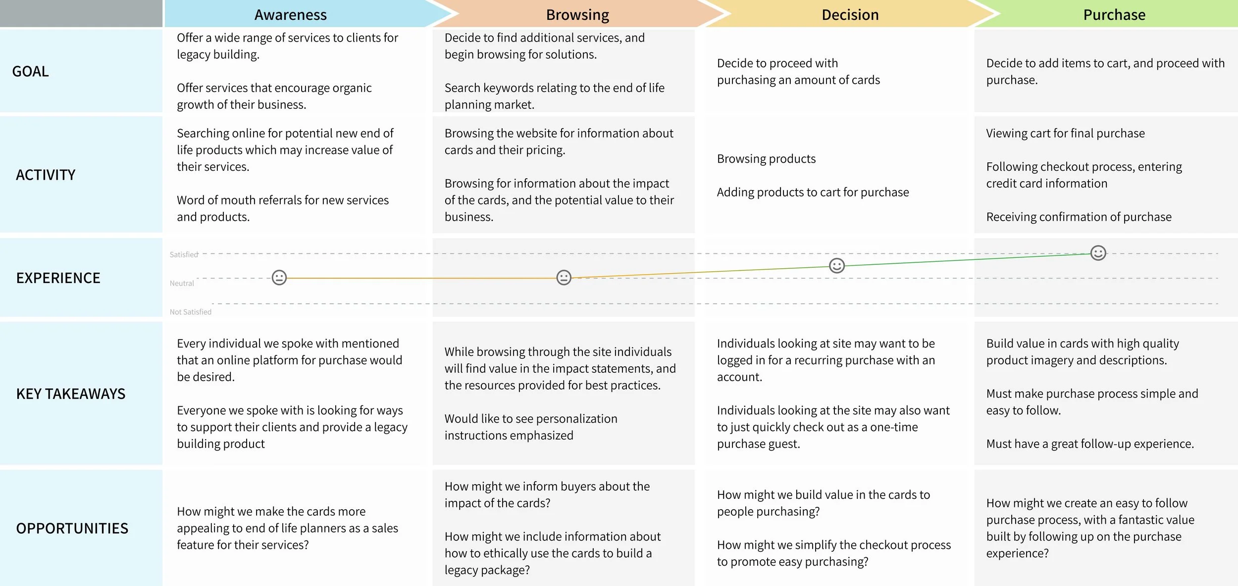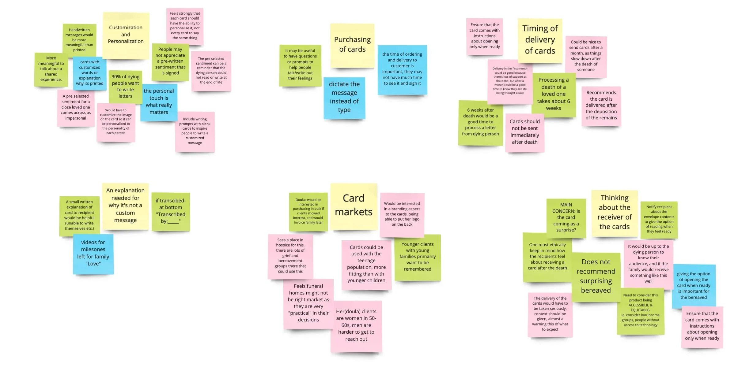 Next, I reached out to stakeholders. Two very distinct users emerged. The first being workers in the end of life industries, and the second being individual users purchasing cards for themselves. From the interviews, it became clear that the workers in the end of life industry were the main target users of the site, as they would be the ones making repeat orders, and bulk orders.