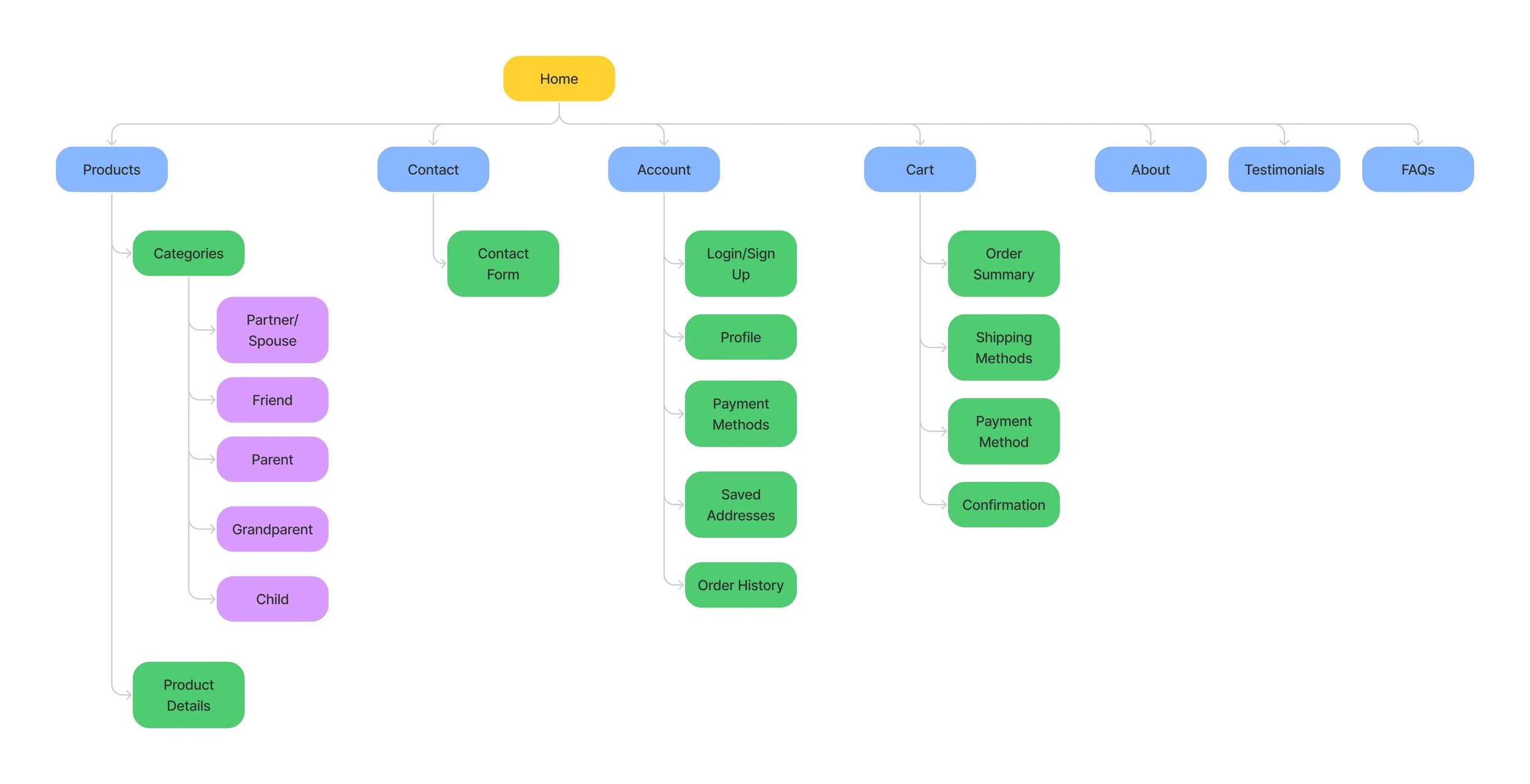 Now that we had laid out all our ideas, and prioritized which solutions we could implement, I laid out a site map. We wanted to organize the site in the most intuitive way for the user.